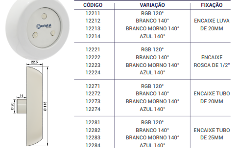 Fixação Encaixe luva de 20mm ou Encaixe Rosca de 1/2" ou Encaixe Tubo de 20mm ou Encaixe Tubo de 25mm